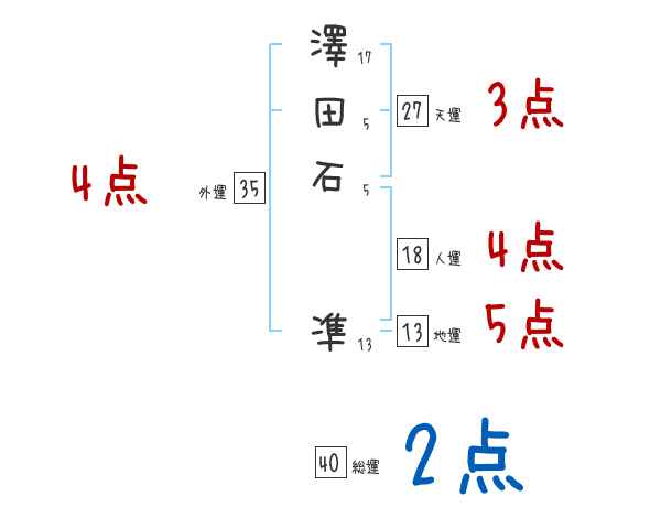 外運![]() | 澤田石凖さんの外運は35画の4つ星!温厚な性格で感受性が高い。穏和な性格で人望が厚い。 生活面を象徴する運勢です。外部から受ける影響力を表し、結婚運、家庭運や職場、環境への順応性を表します。 |