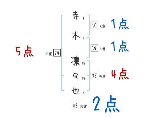 総運![]() | 寺木凛々也さんの総運は43画の2つ星!頑固な性格で独立心が強いかも。やや非現実的で浪費に注意しましょう。 あなたの人生を表す1番重要な運勢です。生涯を通じて影響する総合運となり、主に50歳以降の晩年期に影響を及ぼします。 |