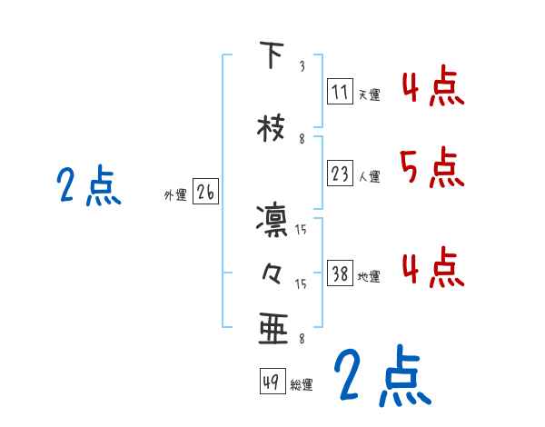 天運![]() | 下枝凛々亜さんの天運は11画の4つ星!着実に富や地位を得る幸運な人生。 家系が持つ宿命的な運勢を表します。祖先から受け継いだ苗字ですので自分の力が及びません。家柄を象徴します。 |