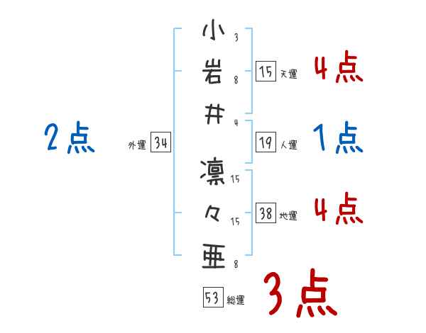 外運![]() | 小岩井凛々亜さんの外運は34画の2つ星!独創性に優れるが、自尊心が強く災難に注意しましょう。 生活面を象徴する運勢です。外部から受ける影響力を表し、結婚運、家庭運や職場、環境への順応性を表します。 |