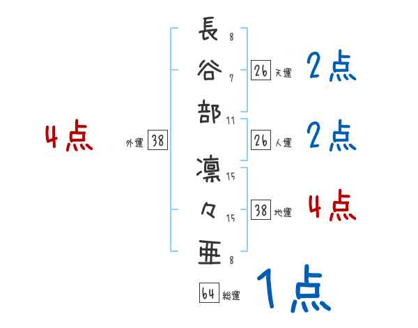 天運![]() | 長谷部凛々亜さんの天運は26画の2つ星!波瀾万丈かも。信頼できる人を大事にしましょう。 家系が持つ宿命的な運勢を表します。祖先から受け継いだ苗字ですので自分の力が及びません。家柄を象徴します。 |