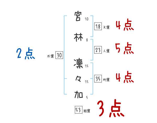天運![]() | 宮林凛々加さんの天運は18画の4つ星!情熱的で剛気。忍耐力があり信頼される。 家系が持つ宿命的な運勢を表します。祖先から受け継いだ苗字ですので自分の力が及びません。家柄を象徴します。 |