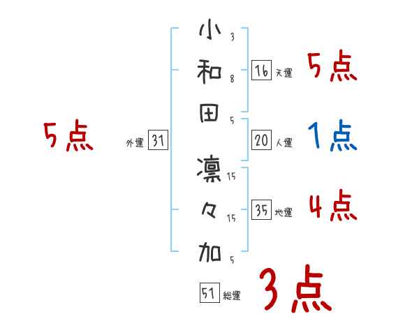 総運![]() | 小和田凛々加さんの総運は51画の3つ星!変化が激しく、危険に注意。堅実な性格。 あなたの人生を表す1番重要な運勢です。生涯を通じて影響する総合運となり、主に50歳以降の晩年期に影響を及ぼします。 |