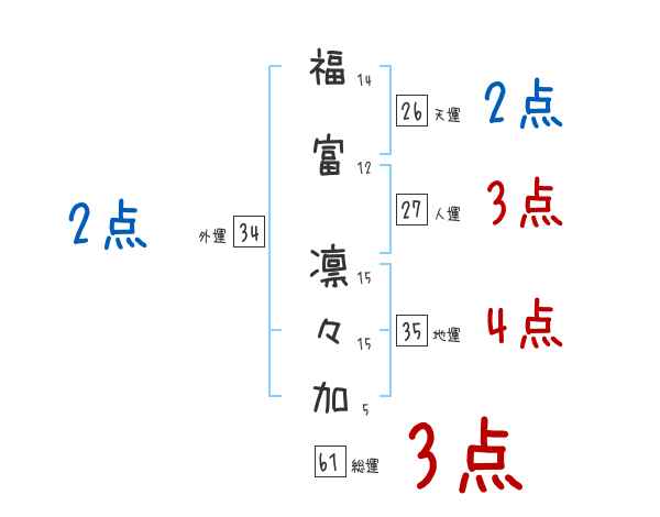 天運![]() | 福富凛々加さんの天運は26画の2つ星!波瀾万丈かも。信頼できる人を大事にしましょう。 家系が持つ宿命的な運勢を表します。祖先から受け継いだ苗字ですので自分の力が及びません。家柄を象徴します。 |