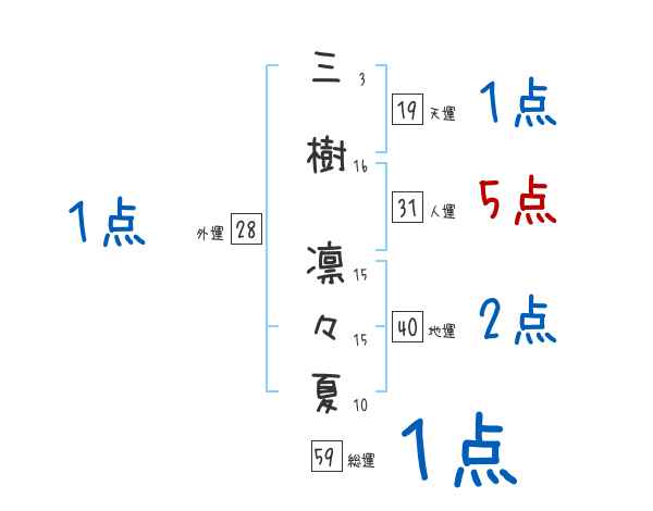 天運![]() | 三樹凛々夏さんの天運は19画の1つ星!優れた才能を持ちますが、協調性が足りないことも。周りの人と協力する事を意識しましょう。 家系が持つ宿命的な運勢を表します。祖先から受け継いだ苗字ですので自分の力が及びません。家柄を象徴します。 |