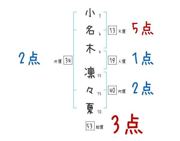 総運![]() | 小名木凛々夏さんの総運は53画の3つ星!やや見栄っ張りで虚栄心がある。散財に注意。 あなたの人生を表す1番重要な運勢です。生涯を通じて影響する総合運となり、主に50歳以降の晩年期に影響を及ぼします。 |