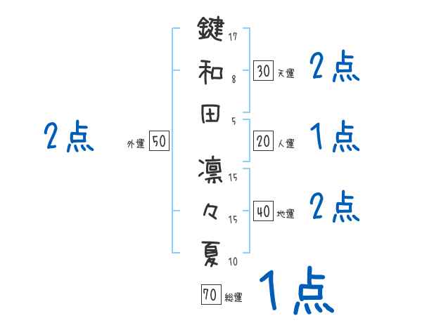 天運![]() | 鍵和田凛々夏さんの天運は30画の2つ星!浮き沈みの激しさに注意しましょう。 家系が持つ宿命的な運勢を表します。祖先から受け継いだ苗字ですので自分の力が及びません。家柄を象徴します。 |