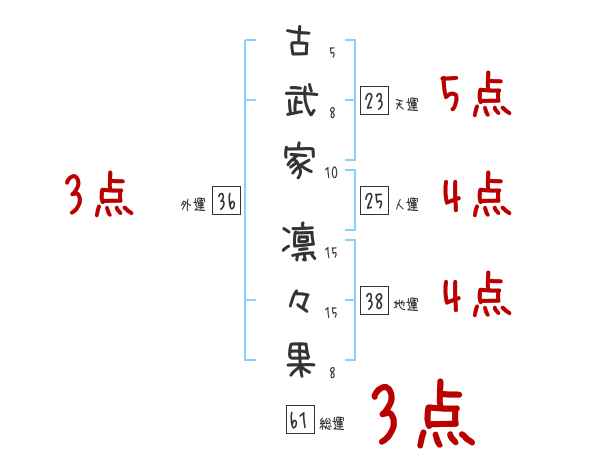 天運![]() | 古武家凛々果さんの天運は23画の5つ星!想像力に優れ活力がある。一代で成功し名誉を手に入れる。 家系が持つ宿命的な運勢を表します。祖先から受け継いだ苗字ですので自分の力が及びません。家柄を象徴します。 |