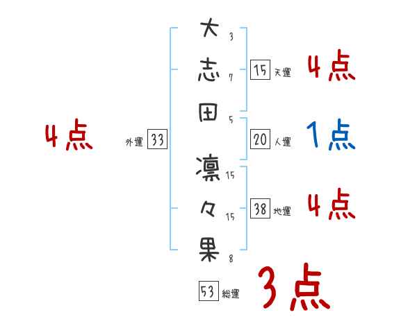 総運![]() | 大志田凛々果さんの総運は53画の3つ星!やや見栄っ張りで虚栄心がある。散財に注意。 あなたの人生を表す1番重要な運勢です。生涯を通じて影響する総合運となり、主に50歳以降の晩年期に影響を及ぼします。 |