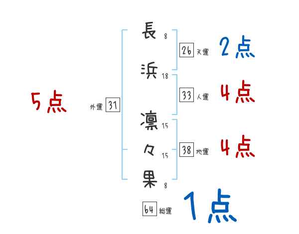 | 天運  | 長浜凛々果さんの天運は26画の2つ星!波瀾万丈かも。信頼できる人を大事にしましょう。家系が持つ宿命的な運勢を表します。祖先から受け継いだ苗字ですので自分の力が及びません。家柄を象徴します。 |