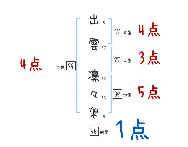 総運![]() | 出雲凛々架さんの総運は56画の1つ星!消極的で無気力になりがち。誠実な気持ちが必要でしょう。 あなたの人生を表す1番重要な運勢です。生涯を通じて影響する総合運となり、主に50歳以降の晩年期に影響を及ぼします。 |