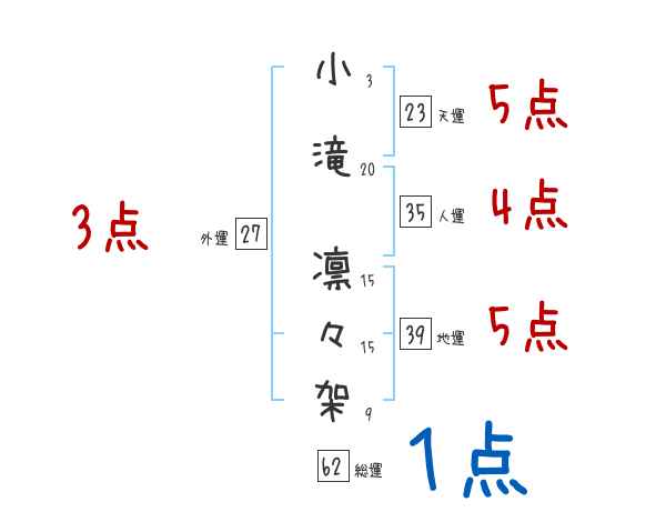 天運![]() | 小滝凛々架さんの天運は23画の5つ星!想像力に優れ活力がある。一代で成功し名誉を手に入れる。 家系が持つ宿命的な運勢を表します。祖先から受け継いだ苗字ですので自分の力が及びません。家柄を象徴します。 |