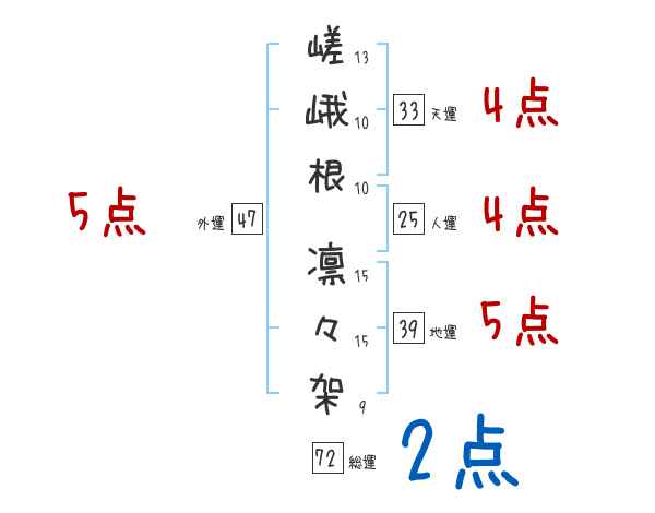 総運![]() | 嵯峨根凛々架さんの総運は72画の2つ星!災難が多く不安定な生活にならないように注意。明暗のある人生かも。 あなたの人生を表す1番重要な運勢です。生涯を通じて影響する総合運となり、主に50歳以降の晩年期に影響を及ぼします。 |