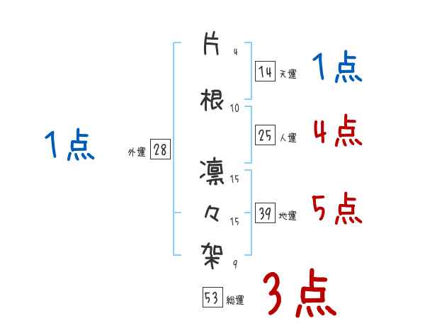 天運![]() | 片根凛々架さんの天運は14画の1つ星!人に対して優しいがストレスを溜め込みがち。人間関係のトラブルを避けるよう気をつけましょう。 家系が持つ宿命的な運勢を表します。祖先から受け継いだ苗字ですので自分の力が及びません。家柄を象徴します。 |