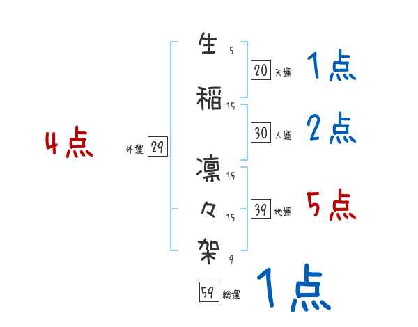 総運![]() | 生稲凛々架さんの総運は59画の1つ星!意志の弱さであきらめることが多いかも。粘り強さが必要。 あなたの人生を表す1番重要な運勢です。生涯を通じて影響する総合運となり、主に50歳以降の晩年期に影響を及ぼします。 |