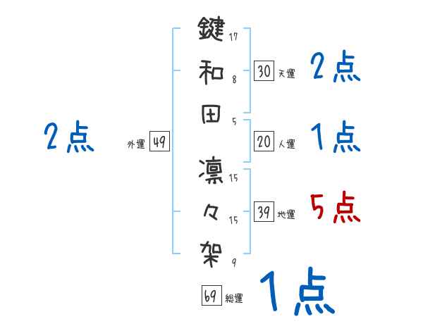天運![]() | 鍵和田凛々架さんの天運は30画の2つ星!浮き沈みの激しさに注意しましょう。 家系が持つ宿命的な運勢を表します。祖先から受け継いだ苗字ですので自分の力が及びません。家柄を象徴します。 |