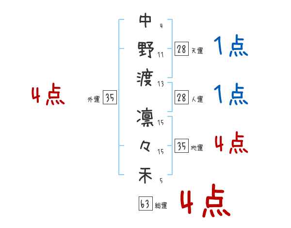 天運![]() | 中野渡凛々禾さんの天運は28画の1つ星!家庭環境に注意。スポーツで活躍できる能力があるかも。 家系が持つ宿命的な運勢を表します。祖先から受け継いだ苗字ですので自分の力が及びません。家柄を象徴します。 |