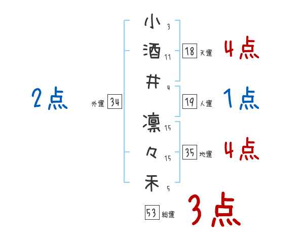 総運![]() | 小酒井凛々禾さんの総運は53画の3つ星!やや見栄っ張りで虚栄心がある。散財に注意。 あなたの人生を表す1番重要な運勢です。生涯を通じて影響する総合運となり、主に50歳以降の晩年期に影響を及ぼします。 |