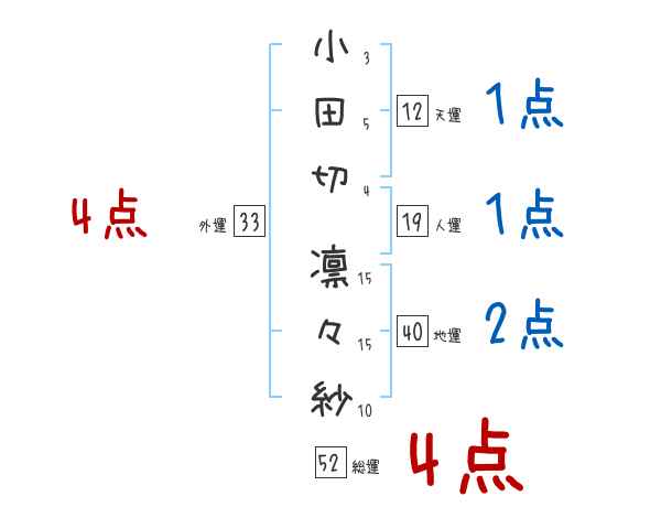 外運![]() | 小田切凛々紗さんの外運は33画の4つ星!権力志向でプライドが高い。勇気があり運を切り開き成功する。 生活面を象徴する運勢です。外部から受ける影響力を表し、結婚運、家庭運や職場、環境への順応性を表します。 |