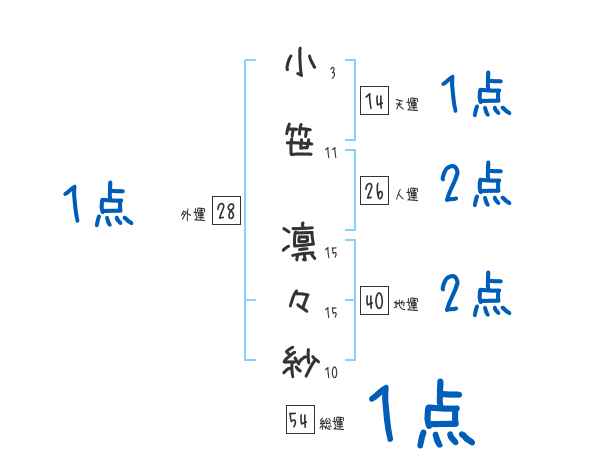 天運![]() | 小笹凛々紗さんの天運は14画の1つ星!人に対して優しいがストレスを溜め込みがち。人間関係のトラブルを避けるよう気をつけましょう。 家系が持つ宿命的な運勢を表します。祖先から受け継いだ苗字ですので自分の力が及びません。家柄を象徴します。 |