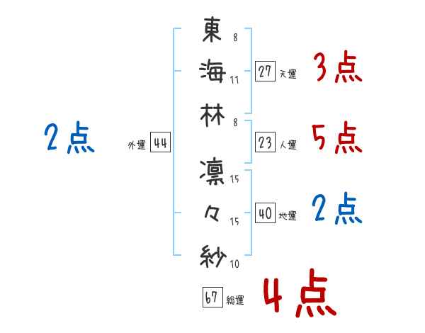人運![]() | 東海林凛々紗さんの人運は23画の5つ星!想像力に優れ活力がある。一代で成功し名誉を手に入れる。 性格や才能などを表す2番目に重要な運勢です。人間関係や協調性、社会的な成功に影響します。主に20歳から50歳ぐらいまでの中年期の運勢を表します。 |