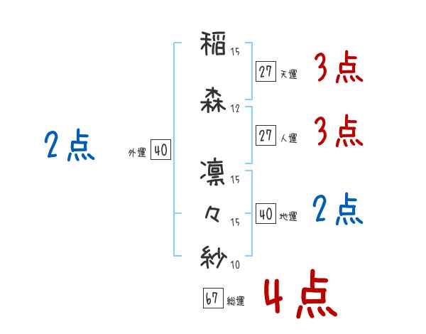 天運![]() | 稲森凛々紗さんの天運は27画の3つ星!頭脳明晰だが強情で摩擦が多い傾向。孤立に注意。 家系が持つ宿命的な運勢を表します。祖先から受け継いだ苗字ですので自分の力が及びません。家柄を象徴します。 |