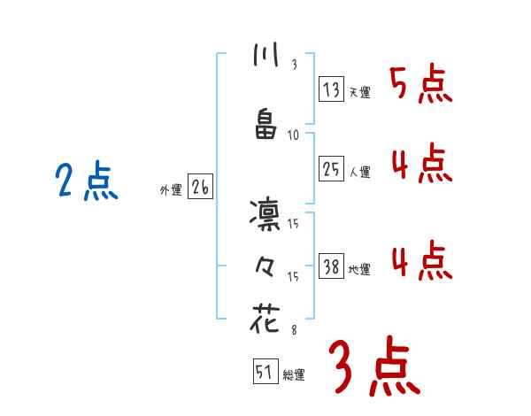 外運![]() | 川畠凛々花さんの外運は26画の2つ星!波瀾万丈かも。信頼できる人を大事にしましょう。 生活面を象徴する運勢です。外部から受ける影響力を表し、結婚運、家庭運や職場、環境への順応性を表します。 |