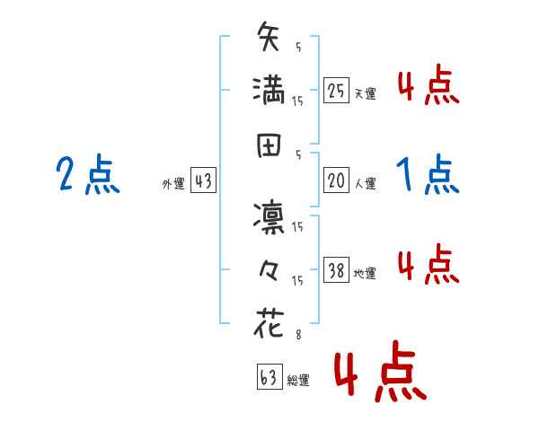 天運![]() | 矢満田凛々花さんの天運は25画の4つ星!個性があり才能があふれる。強運の持ち主で発展する。 家系が持つ宿命的な運勢を表します。祖先から受け継いだ苗字ですので自分の力が及びません。家柄を象徴します。 |