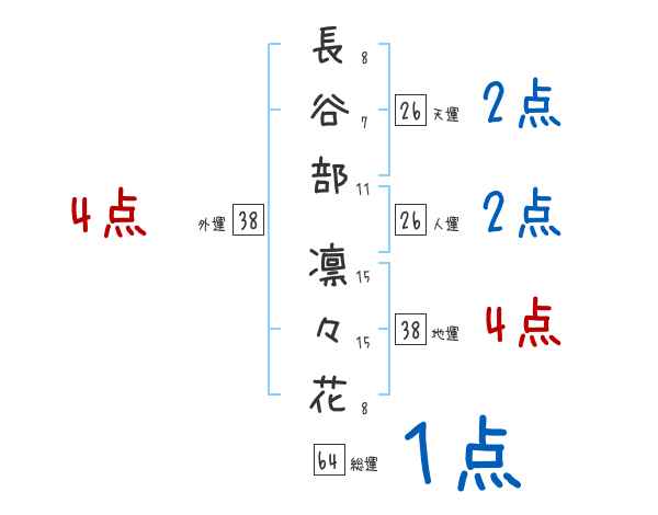 天運![]() | 長谷部凛々花さんの天運は26画の2つ星!波瀾万丈かも。信頼できる人を大事にしましょう。 家系が持つ宿命的な運勢を表します。祖先から受け継いだ苗字ですので自分の力が及びません。家柄を象徴します。 |