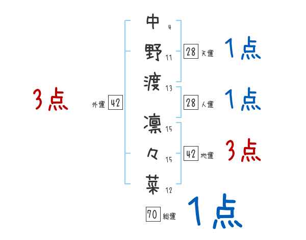 外運![]() | 中野渡凛々菜さんの外運は42画の3つ星!病気に注意。多芸であるが消極的でおとなしい。 生活面を象徴する運勢です。外部から受ける影響力を表し、結婚運、家庭運や職場、環境への順応性を表します。 |