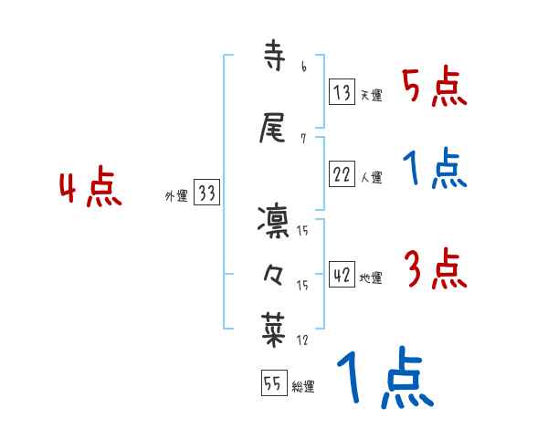 外運![]() | 寺尾凛々菜さんの外運は33画の4つ星!権力志向でプライドが高い。勇気があり運を切り開き成功する。 生活面を象徴する運勢です。外部から受ける影響力を表し、結婚運、家庭運や職場、環境への順応性を表します。 |