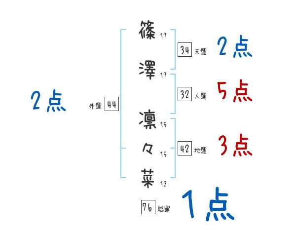 人運![]() | 篠澤凛々菜さんの人運は32画の5つ星!柔軟性があり成功する。チャンスが多く金運が良い。 性格や才能などを表す2番目に重要な運勢です。人間関係や協調性、社会的な成功に影響します。主に20歳から50歳ぐらいまでの中年期の運勢を表します。 |