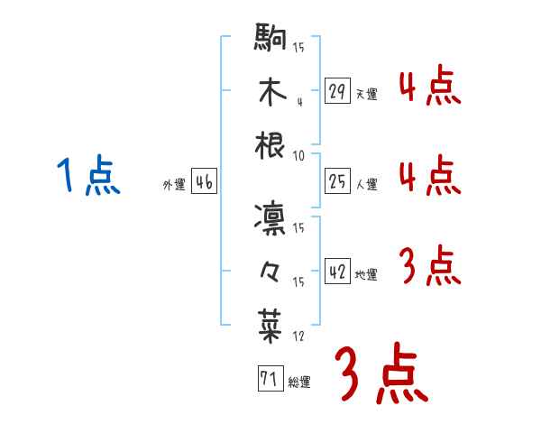 天運![]() | 駒木根凛々菜さんの天運は29画の4つ星!完全主義で才能がある。厳格な心の持ち主。 家系が持つ宿命的な運勢を表します。祖先から受け継いだ苗字ですので自分の力が及びません。家柄を象徴します。 |