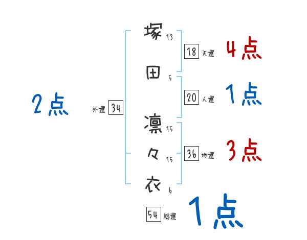 天運![]() | 塚田凛々衣さんの天運は18画の4つ星!情熱的で剛気。忍耐力があり信頼される。 家系が持つ宿命的な運勢を表します。祖先から受け継いだ苗字ですので自分の力が及びません。家柄を象徴します。 |