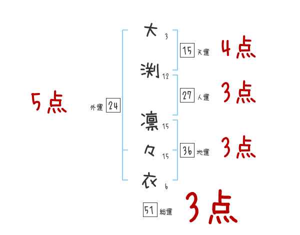 総運![]() | 大渕凛々衣さんの総運は51画の3つ星!変化が激しく、危険に注意。堅実な性格。 あなたの人生を表す1番重要な運勢です。生涯を通じて影響する総合運となり、主に50歳以降の晩年期に影響を及ぼします。 |