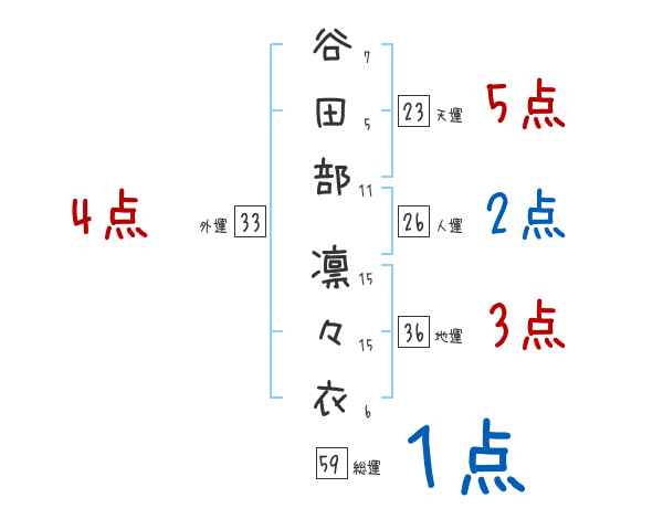 外運![]() | 谷田部凛々衣さんの外運は33画の4つ星!権力志向でプライドが高い。勇気があり運を切り開き成功する。 生活面を象徴する運勢です。外部から受ける影響力を表し、結婚運、家庭運や職場、環境への順応性を表します。 |