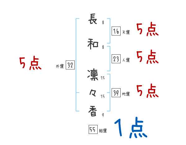 外運![]() | 長和凛々香さんの外運は32画の5つ星!柔軟性があり成功する。チャンスが多く金運が良い。 生活面を象徴する運勢です。外部から受ける影響力を表し、結婚運、家庭運や職場、環境への順応性を表します。 |