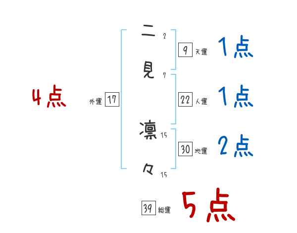 天運![]() | 二見凛々さんの天運は9画の1つ星!消極的で才能を発揮することが苦手なことも。周りの意見に耳を傾けましょう。 家系が持つ宿命的な運勢を表します。祖先から受け継いだ苗字ですので自分の力が及びません。家柄を象徴します。 |