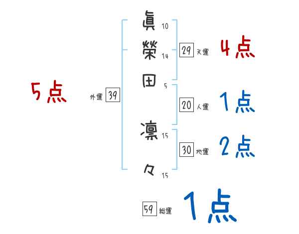 外運![]() | 眞榮田凛々さんの外運は39画の5つ星!社交性に優れ人望が厚い。人の上に立ち成功する。 生活面を象徴する運勢です。外部から受ける影響力を表し、結婚運、家庭運や職場、環境への順応性を表します。 |