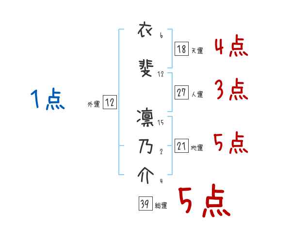 総運![]() | 衣斐凛乃介さんの総運は39画の5つ星!社交性に優れ人望が厚い。人の上に立ち成功する。 あなたの人生を表す1番重要な運勢です。生涯を通じて影響する総合運となり、主に50歳以降の晩年期に影響を及ぼします。 |