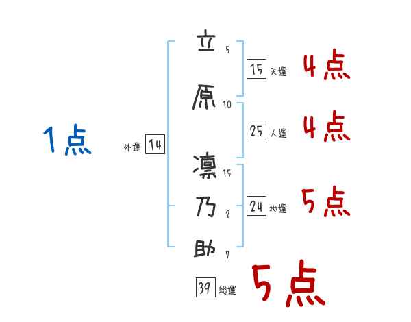 総運![]() | 立原凛乃助さんの総運は39画の5つ星!社交性に優れ人望が厚い。人の上に立ち成功する。 あなたの人生を表す1番重要な運勢です。生涯を通じて影響する総合運となり、主に50歳以降の晩年期に影響を及ぼします。 |