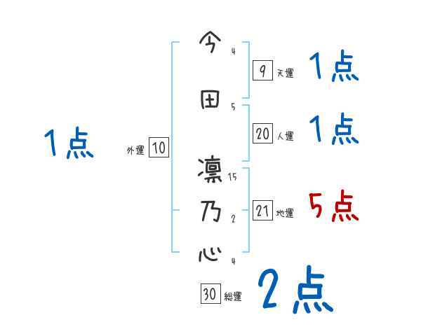 天運![]() | 今田凛乃心さんの天運は9画の1つ星!消極的で才能を発揮することが苦手なことも。周りの意見に耳を傾けましょう。 家系が持つ宿命的な運勢を表します。祖先から受け継いだ苗字ですので自分の力が及びません。家柄を象徴します。 |