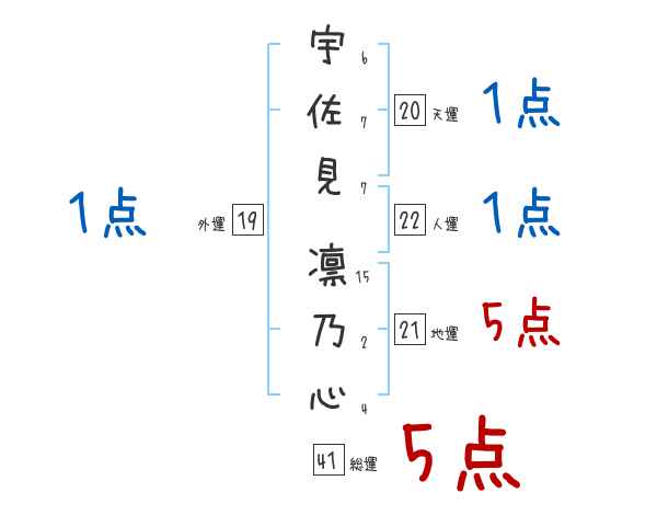 総運![]() | 宇佐見凛乃心さんの総運は41画の5つ星!大志を抱き、目標に向かって実力を発揮し達成する。温和な性格。 あなたの人生を表す1番重要な運勢です。生涯を通じて影響する総合運となり、主に50歳以降の晩年期に影響を及ぼします。 |