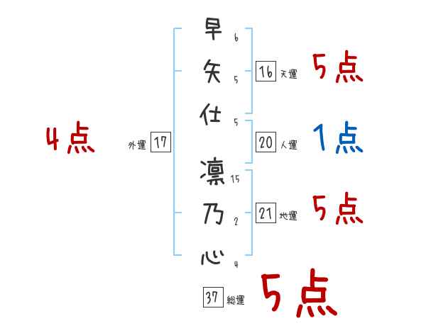 外運![]() | 早矢仕凛乃心さんの外運は17画の4つ星!積極的な行動力。地位を気づき財産を手に入れる。純粋な心と直感力。 生活面を象徴する運勢です。外部から受ける影響力を表し、結婚運、家庭運や職場、環境への順応性を表します。 |
