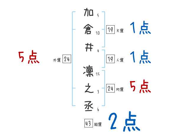 天運![]() | 加倉井凛之丞さんの天運は19画の1つ星!優れた才能を持ちますが、協調性が足りないことも。周りの人と協力する事を意識しましょう。 家系が持つ宿命的な運勢を表します。祖先から受け継いだ苗字ですので自分の力が及びません。家柄を象徴します。 |