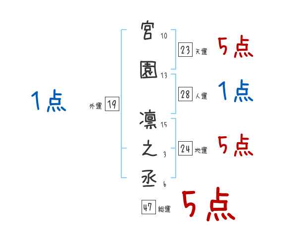 人運![]() | 宮園凛之丞さんの人運は28画の1つ星!家庭環境に注意。スポーツで活躍できる能力があるかも。 性格や才能などを表す2番目に重要な運勢です。人間関係や協調性、社会的な成功に影響します。主に20歳から50歳ぐらいまでの中年期の運勢を表します。 |