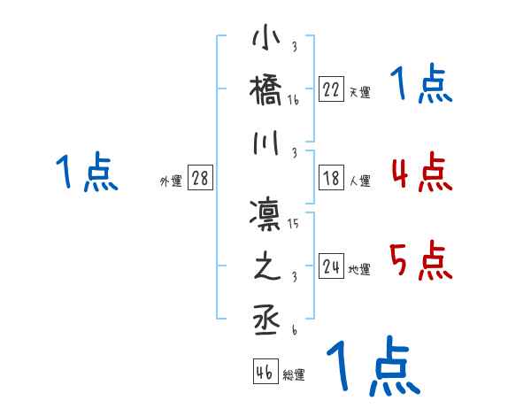 総運![]() | 小橋川凛之丞さんの総運は46画の1つ星!迷走することが多く苦労するかも。目先のことにとらわれないように。 あなたの人生を表す1番重要な運勢です。生涯を通じて影響する総合運となり、主に50歳以降の晩年期に影響を及ぼします。 |