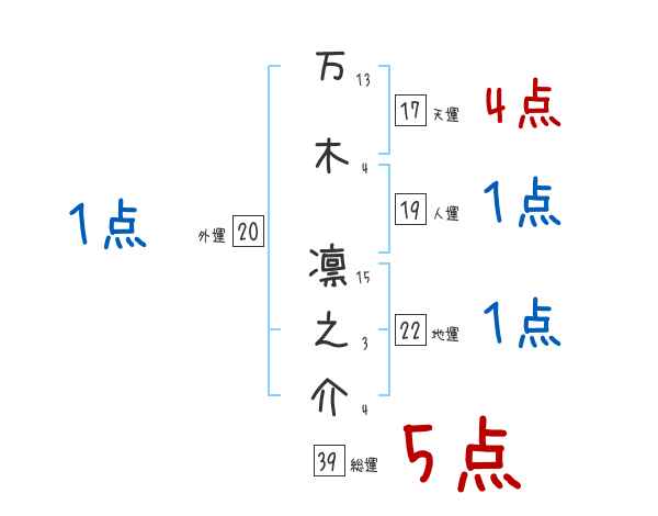 総運![]() | 万木凛之介さんの総運は39画の5つ星!社交性に優れ人望が厚い。人の上に立ち成功する。 あなたの人生を表す1番重要な運勢です。生涯を通じて影響する総合運となり、主に50歳以降の晩年期に影響を及ぼします。 |