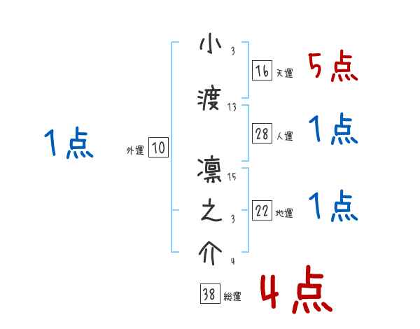 天運![]() | 小渡凛之介さんの天運は16画の5つ星!人望が厚く大きく発展する。逆転成功が見える。 家系が持つ宿命的な運勢を表します。祖先から受け継いだ苗字ですので自分の力が及びません。家柄を象徴します。 |