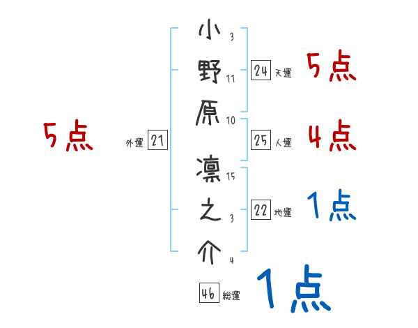 外運![]() | 小野原凛之介さんの外運は21画の5つ星!統率力がある。独立し成功する。名誉を手に入れる。 生活面を象徴する運勢です。外部から受ける影響力を表し、結婚運、家庭運や職場、環境への順応性を表します。 |
